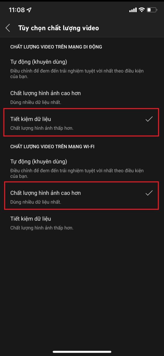 - Ở mục Chất lượng Video trên mạng di động chọn "Tiết kiệm dữ liệu", Chất lượng Video trên mạng Wifi các bạn chọn "Chất lượng hình ảnh cao hơn"